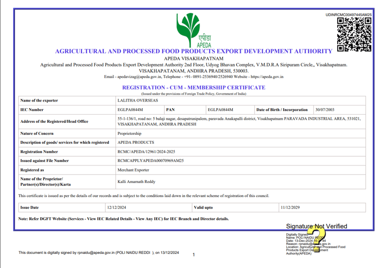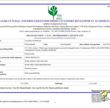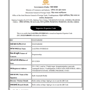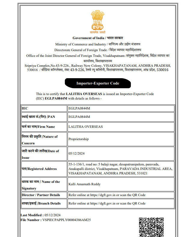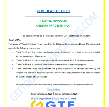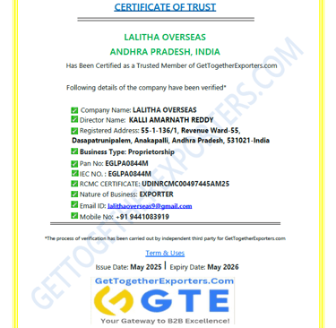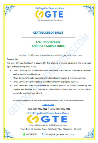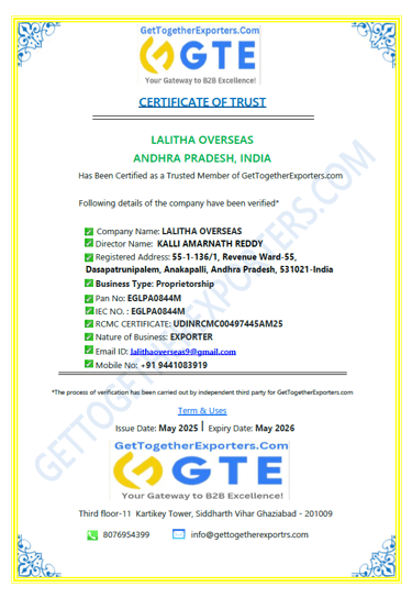 Global Supplier Certifications Call Us : +91 9441083919 Write Us : lalithaoverseas9@gmail.com